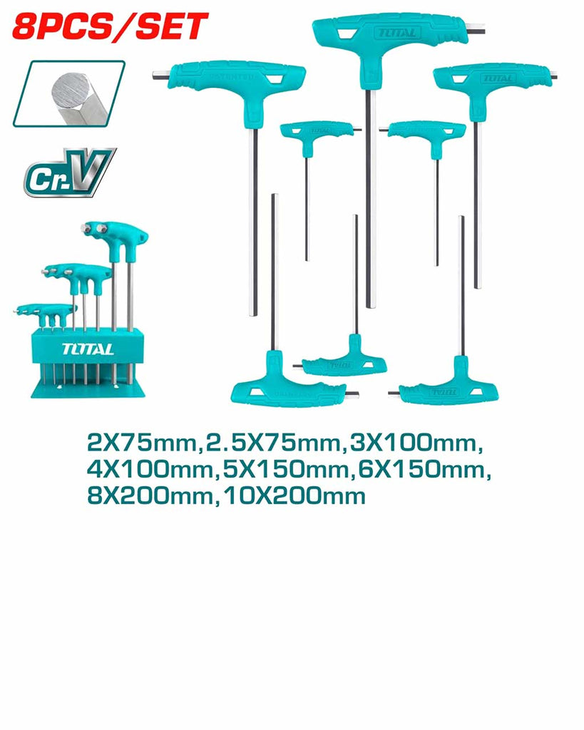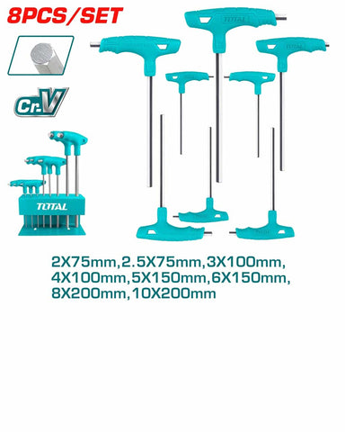 8 Pcs T-handle hex wrench set Size:2X75,2.5X75,3X100,4X100,5X150,6X150,8X200,10X200 Material:Cr-V,Heat treatment and chrome plate Brand exclusive shelf Packed by double blister