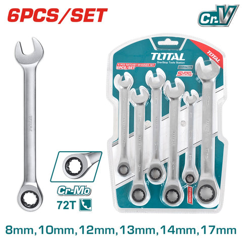 6 Pcs Ratchet spanner setHigh quality Cr-Mo ratchetSize: 8-17mm8mm,10mm,12mm,13mm,14mm,17mmMaterial: Cr-VFine polishedPacked by half double blister