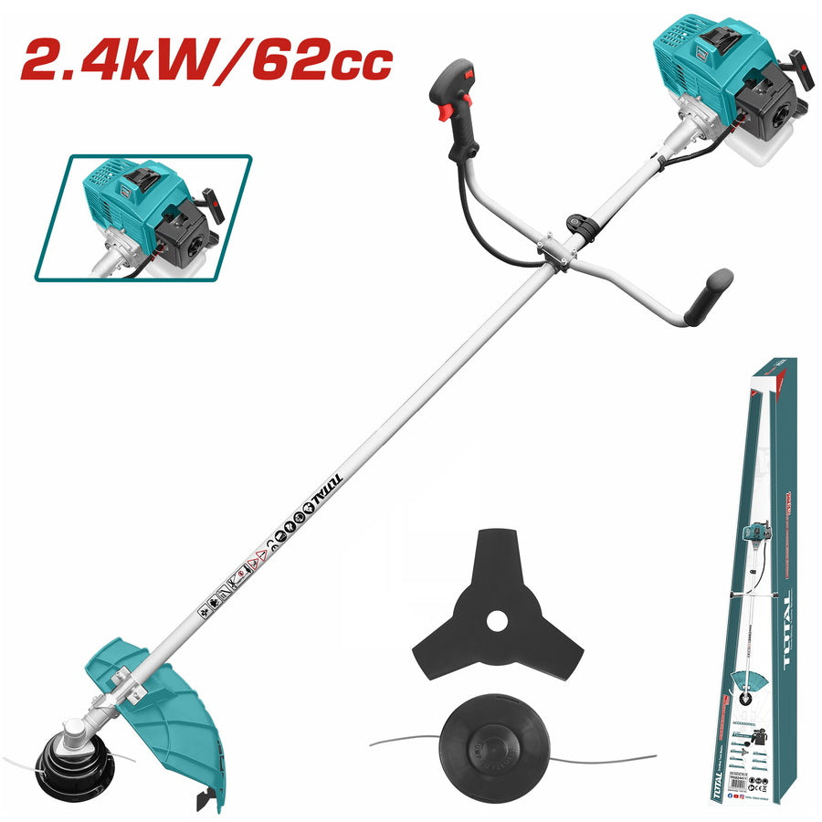 GASOLINE BRUSH CUTTER 2 STROKE MOTOR 43CC 2HP 1.2L FUEL TANK MAX SPEED 9000RPM MAX CUTTING PATH 460MM Wacker SPOOL LINER 2.5MM X 4M BLADE DIAMETER 230MM 2 FUNCTION TRIMMER & CUTTER BRAND: TOTAL
