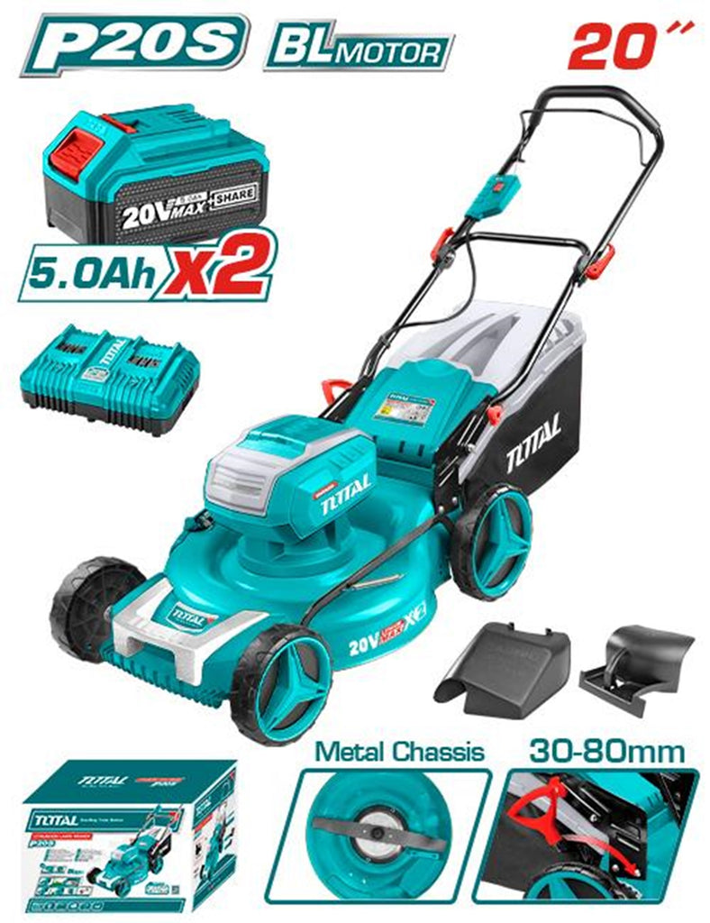 Brushless Motor Voltage: 40V(20V+20V) No-load speed: 2800rpm Maximum cutting diameter: 510mm Bag capacity: 60L Cutting height range: 30-80mm Cutting hegith positions: 8 gears 3 functions: bagging/mulching/side-discharge Charge volts:110-120V~50/60Hz With 2pcs 5.0Ah battery pack With 1pcs dual-port charger WIth 1pcs grass bag With 1pcs mulching ...