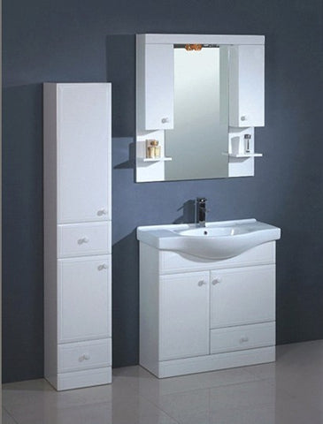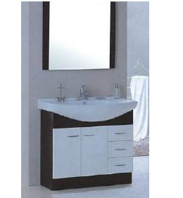 1) Size: cabinet + basin: 800*450*850mm, framed mirror: 600*900mm; 2) Material: PVC cabinet + ceramic basin + framed mirror; 3) Structure: two doors; 4) Finishing: lacquered; 5) Hardware: with soft-closing;