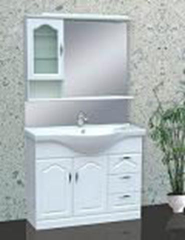 1)Size: cabinet + basin: 1000*510*860mm, mirror: 900*600mm; 2) Material:PVC cabinet + ceramic basin + framed mirror; 3) Structure: two doors and three drawers; 4)Finishing: lacquered; ...