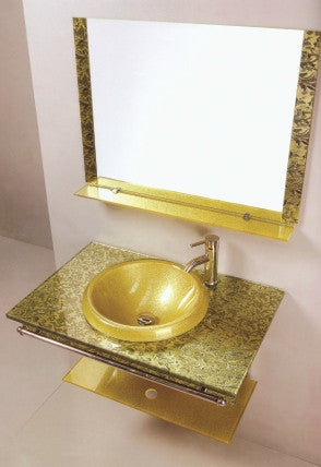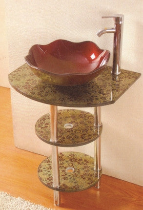 Shelf Material: Tempered Glass Top: Tempered Glass Sink: Tempered Glass, Fabricated into the Top. Shelf Brackets and Cross bar: Chrome plated Hollow sections. Mirror: Included Faucet is NOT included