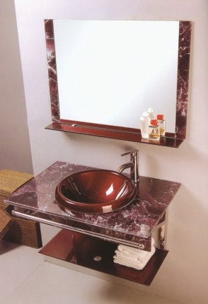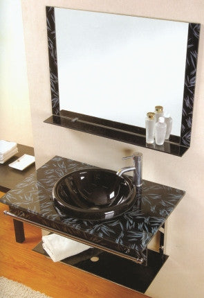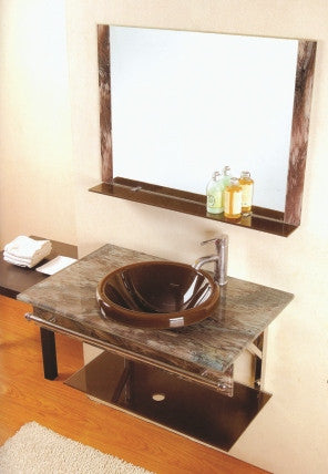 Approx. size: 36" (W) X 21" Shelf Material: Tempered Glass Top: Tempered Glass Sink: Tempered Glass, Fabricated into the Top. Shelf Brackets and Cross bar: Chrome plated Hollow sections. Mirror: Included Faucet is NOT included