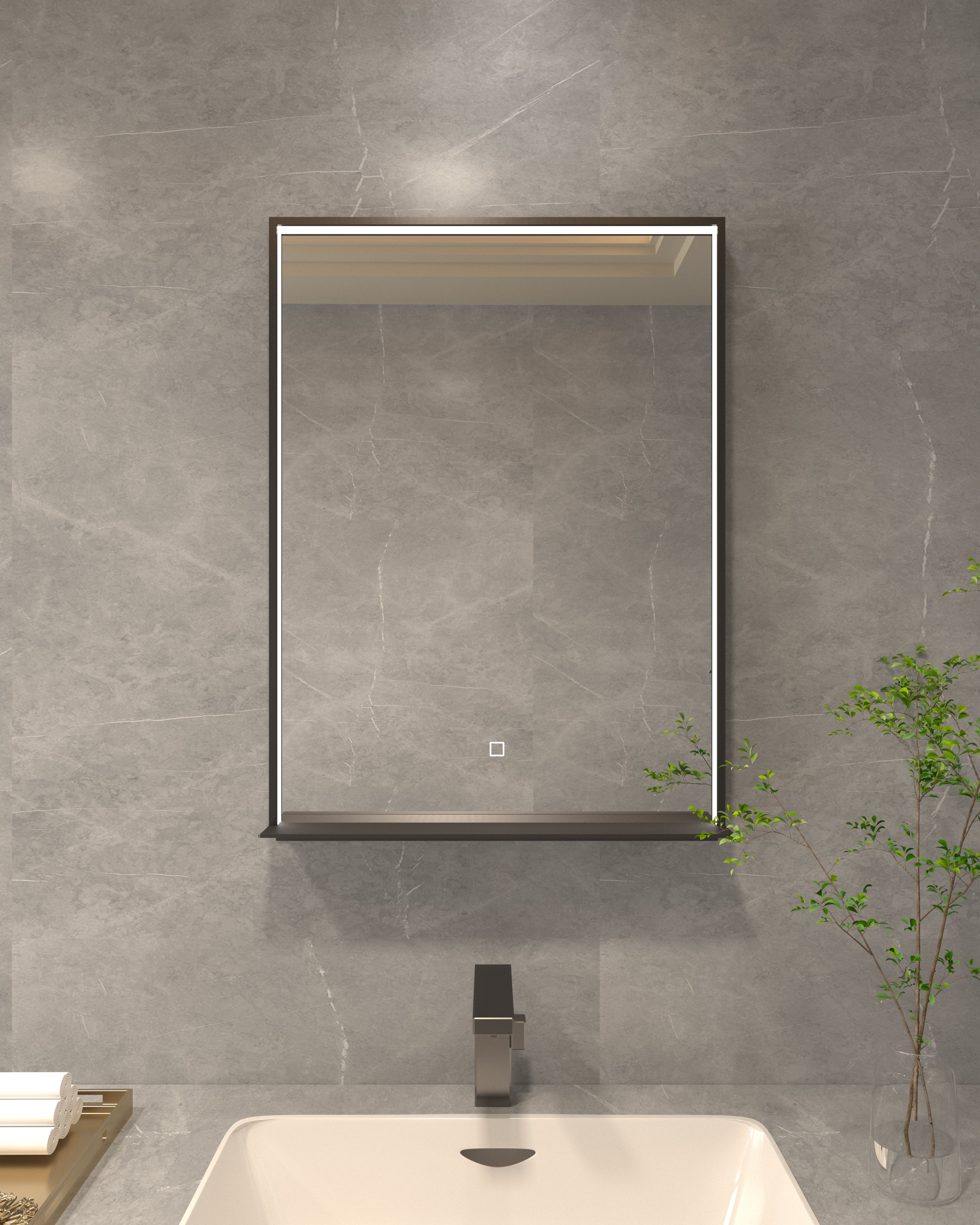Approx. size: 36" (W) X 21" Shelf Material: Tempered Glass Top: Tempered Glass Sink: Tempered Glass, Fabricated into the Top. Shelf Brackets and Cross bar: Chrome plated Hollow sections. Mirror: Included Faucet is NOT included